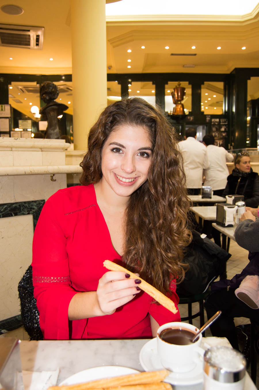 After waiting in line and ordering, we were ready for our churros and hot chocolate experience. The churros came out hot and we dosed them in powdered sugar. The hot chocolate is much thicker than I imagined and I was surprised to see a lot of people drinking it out of the cup. Yet, I fully played into to the experience, dipping my churros and drinking some of the excess hot chocolate. I finished every bite, yet I would’ve been better off splitting an order.