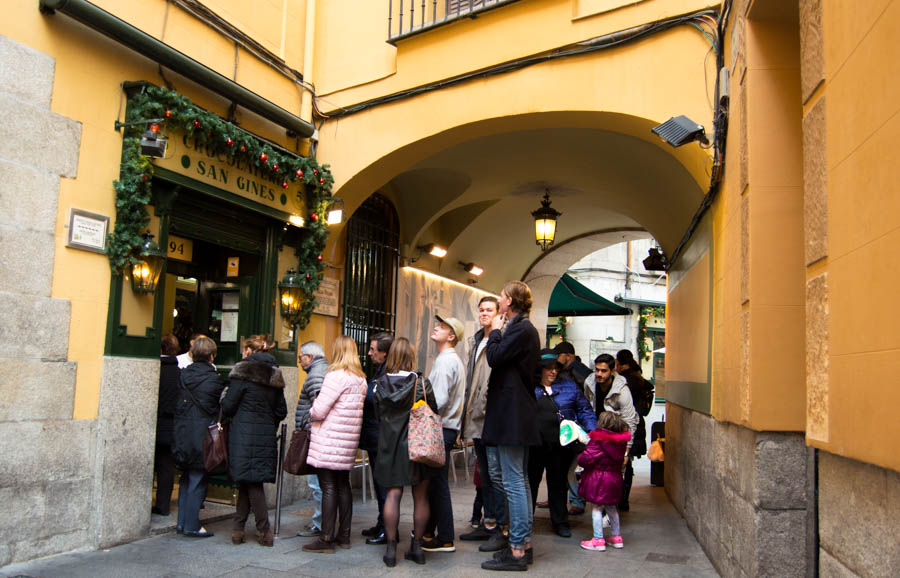 A visit to Chocolaterรญa San Ginรฉs should be on the top of you list when visiting Madrid. Churros and hot chocolate are a staple in Spain, yet San Ginรฉs takes it to the next level. This cafe, located in old Madrid is filled with people all day. The line extends into the passage way outside the cafe. The line is worth the wait for this quintessential experience.
