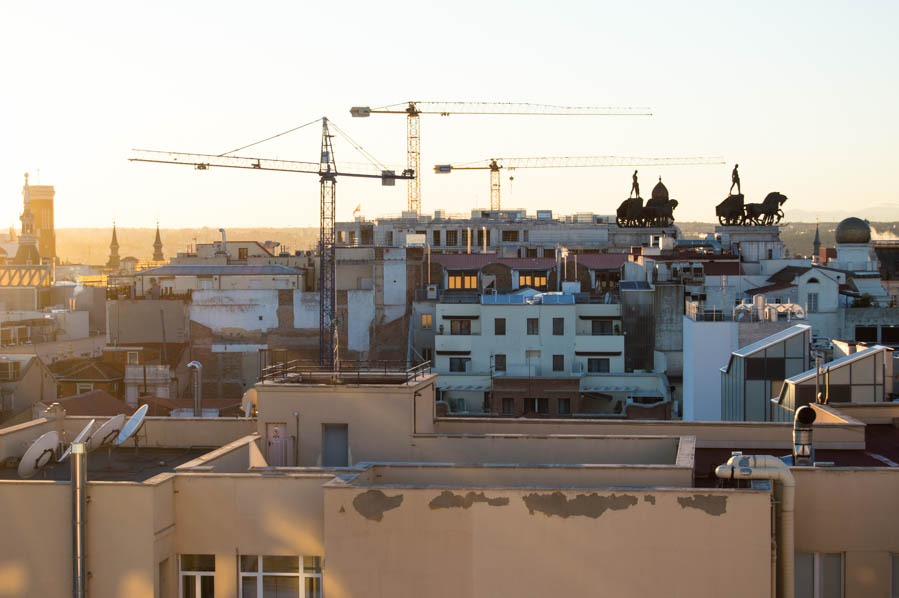 After checking out all the views, we grabbed a glass of reasonably priced wine. (It was โฌ4 for a glass of wine at a rooftop bar!) It was a cinematographic moment; wine in-hand, watching the sunset on Madrid.